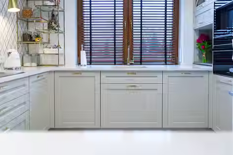 Jasna kuchnia z eleganckimi złotymi detalami,